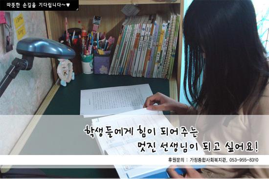 ±×·¯³ª Àºº°(°¡¸í)ÀÌ´Â ÀÌ·¯ÇÑ ¾î·Á¿î ȯ°æ¿¡µµ ºÒ±¸Çϰí ÀÚ½ÅÀÇ »óȲÀ» ¿ø¸ÁÇÏÁö ¾Ê°í ÇÒ¸Ó´Ï¿Í µ¿»ýµé¿¡°Ô ÈûÀÌ µÇ°íÀÚ ¾¿¾¿ÇÏ°Ô »ì°í ÀÖ½À´Ï´Ù. Àºº°(°¡¸í)ÀÌ´Â ÀڽŰú °°ÀÌ ¾î·Á¿î óÁö¿¡ ³õ¿© ÀÖÀ½¿¡µµ ºÒ±¸ÇÏ°í ²ÞÀ» ²Ù°í »ì¾Æ°¡´Â Çлýµé¿¡°Ô ÈûÀÌ µÇ¾îÁÖ´Â ¸ÚÁø ¼±»ý´ÔÀÌ µÇ±â À§ÇØ ¿À´Ãµµ ÃÖ¼±À» ´ÙÇϰí ÀÖ½À´Ï´Ù.